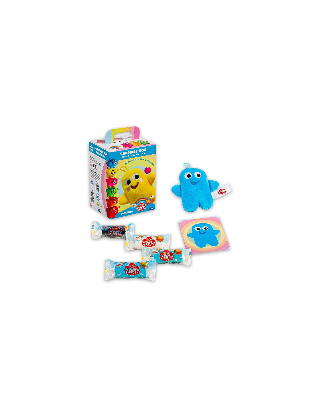 Sono sei confezioni “blind”, tutte uguali all’esterno ma con un contenuto diverso da collezionare. In ogni scatola c’è un simpatico peluche morbido, realizzato in tessuto sicuro e lavabile, insieme a quattro salsicciotti di pasta Didò e alla speciale “bidiformina” per modellare con la pasta il suo doppio.