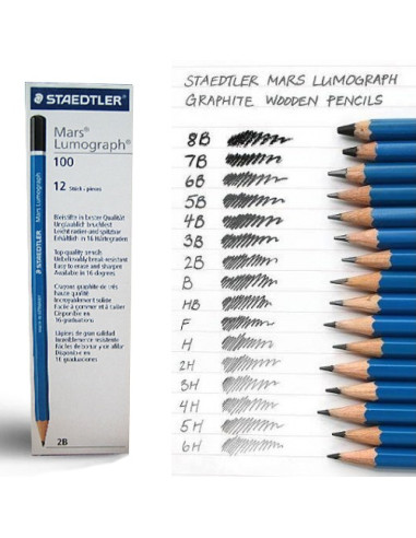 Staedtler Mars Lumograph 100. Matita di elevata qualità per disegno, schizzi e scrittura su carta e pellicole da disegno. Particolarmente resistente alla rottura grazie ad una speciale formulazione della mina e a una solida incollatura al legno. Cancellabile e temperabile con facilità. Gradazione: 10B Conf. 12pz