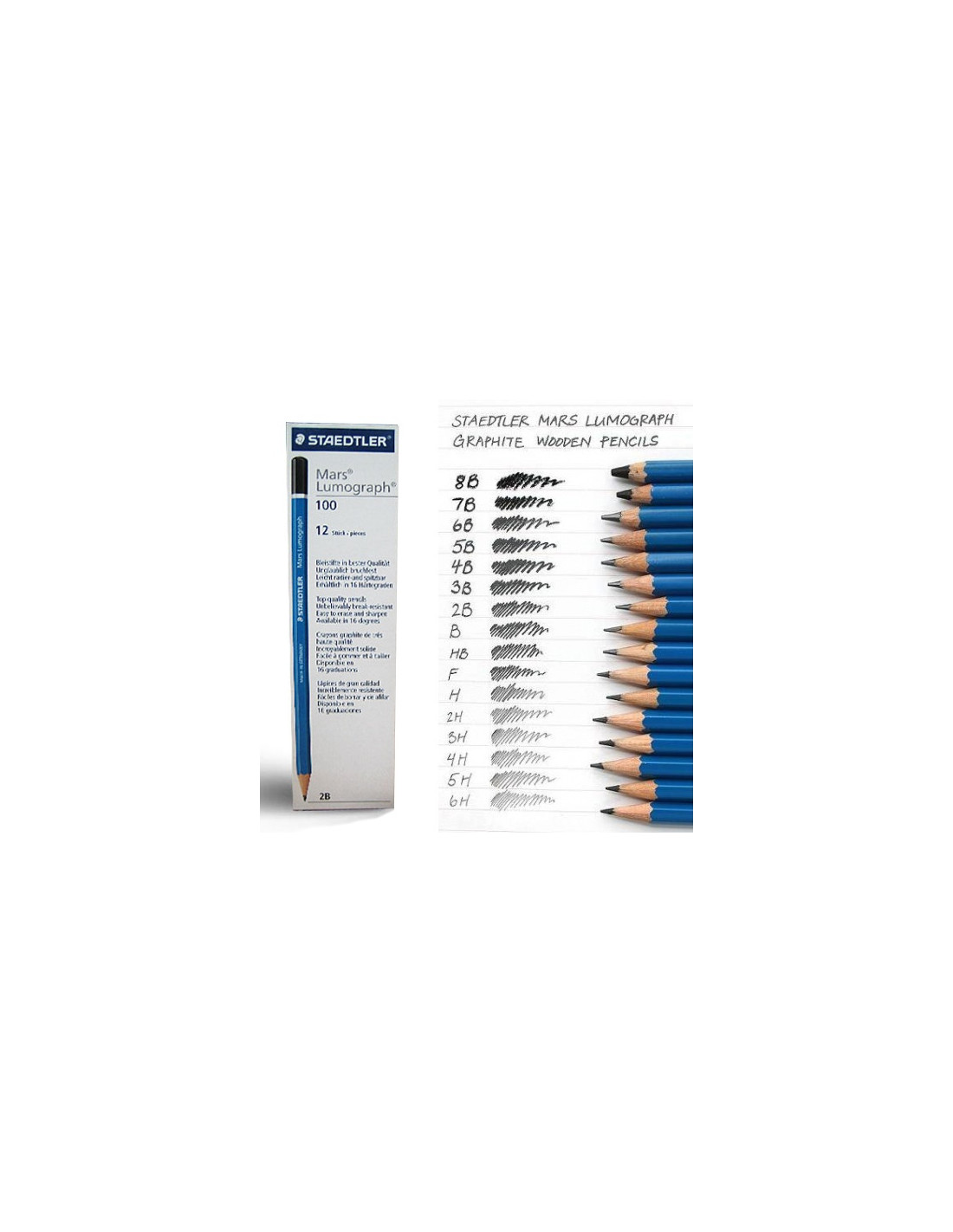 Staedtler Mars Lumograph 100. Matita di elevata qualità per disegno, schizzi e scrittura su carta e pellicole da disegno. Particolarmente resistente alla rottura grazie ad una speciale formulazione della mina e a una solida incollatura al legno. Cancellabile e temperabile con facilità. Gradazione: 12B Conf. 12pz